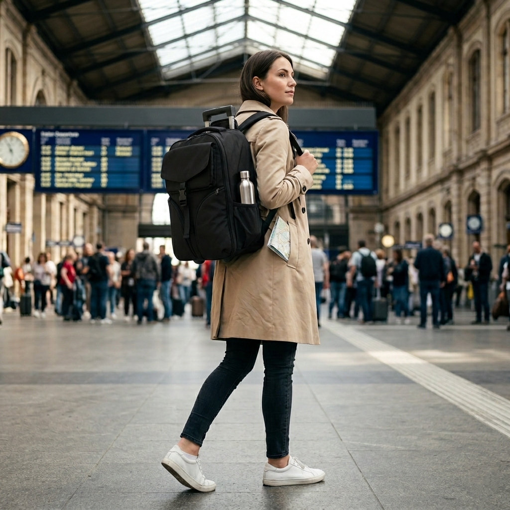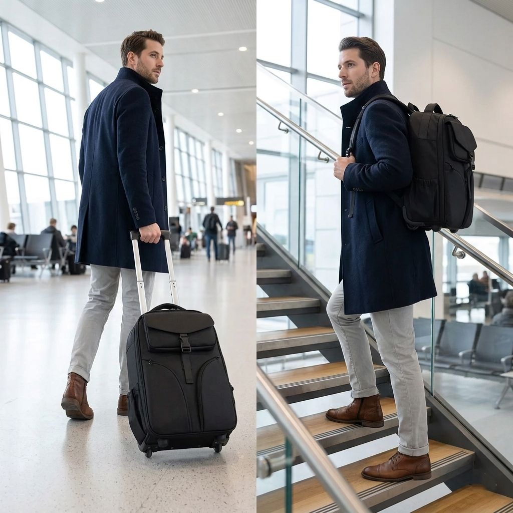 Vous êtes à l'aéroport Charles de Gaulle, couloir long de 400 mètres, sol lisse. Vous sortez la poignée télescopique du BAGLIO MinimaX™ RollAir, les roues silencieuses caoutchouc touchent le sol, et vous avancez sans effort, sans douleur dans les épaules, sans transpirer. Vous arrivez à votre hôtel, l'ascenseur est en panne, 3 étages d'escaliers vous attendent. En 3 secondes – zip du panneau dorsal, bretelles dépliées, sac sur le dos – vous montez les marches sans vous battre avec une valise à roulettes récalcitrante. C'est exactement pour ces situations que le RollAir a été conçu. Un seul sac. Deux modes. La liberté totale de choisir selon le terrain, pas selon le sac que vous avez acheté.