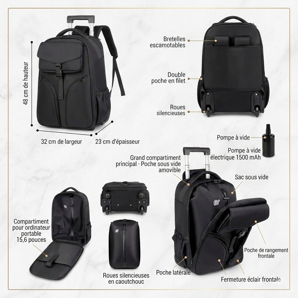 Le BAGLIO MinimaX™ RollAir est le sac de voyage ultime qui refuse de choisir entre sac à dos et valise. En mode trolley, sa poignée télescopique aluminium de 91cm et ses roues silencieuses le font glisser sans effort dans les couloirs d'aéroport. En mode sac à dos, ses bretelles escamotables le transforment instantanément en backpack confortable. Et sa poche vacuum avec pompe électrique intégrée 1500mAh comprime vos vêtements à la vitesse d'un bouton. Deux sacs en un. Zéro compromis.
